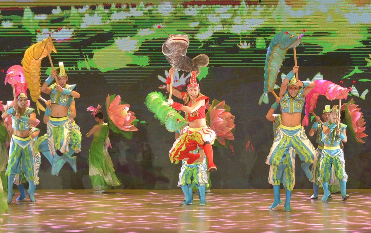 开场舞《五虾闹鲇》是荆州市省级非物质文化遗产舞蹈项目,并于今年在我校365英国上市公司创建传承基地,演员们以其灵活多变的身手,娴熟的动作配合,运用舞蹈道具五只彩虾与一只鲇鱼在上下穿游、自如翻飞的舞动中表现出鱼虾在水中和谐共生、快乐嬉戏的情景,反映了人们对众生和谐共处的追求,极具浓郁的水乡气息和荆楚地方特色。