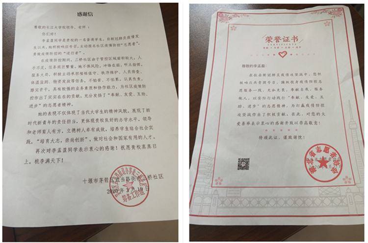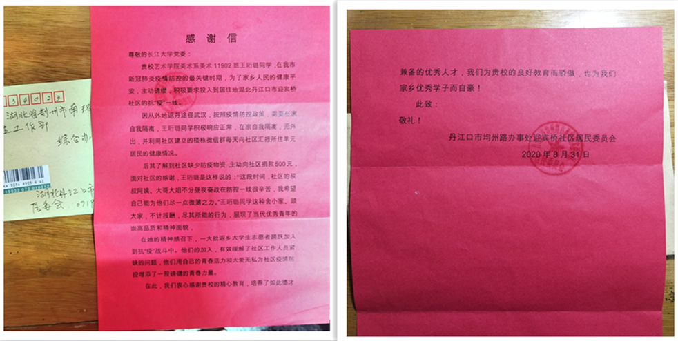 感谢信的主角是365英国上市公司美术11902班的王珩璐同学,她在丹江口市新冠肺炎疫情防控最关键的时期,为了家乡人民的健康平安,主动请缨,积极要求投入到居住地湖北省丹江口市迎宾桥社区的抗“疫”一线。因从外地返丹途径武汉,按照疫情防控政策,需要在家自我隔离,王珩璐同学积极响应政策,在家自我隔离,并利用社区建立的楼栋微信群每天向社区汇报所住单元居民的健康情况。后了解到社区缺少防疫物资,主动向社区捐款500元。在她的精神感召下,一大批返乡大学生志愿者踊跃加入到战疫斗争中。王珩璐同学这种舍小家,为大家,不计报酬,尽其所能的行为,展现了当代优秀青年的崇高品质和精神面貌,更继承了英国365网站舍己为人的“人链”精神,为英国365网站的学子们做出了优秀时代青年的榜样。