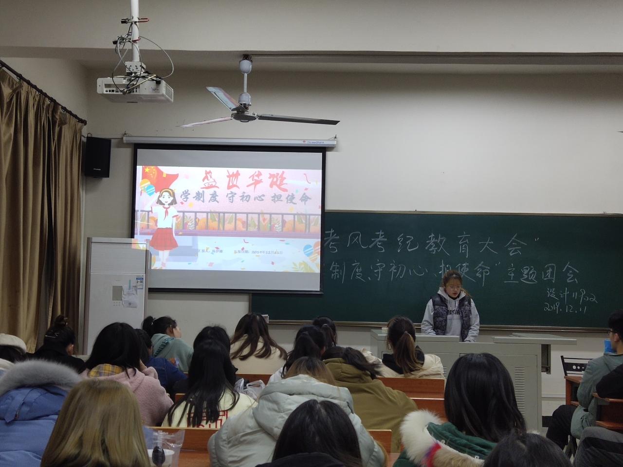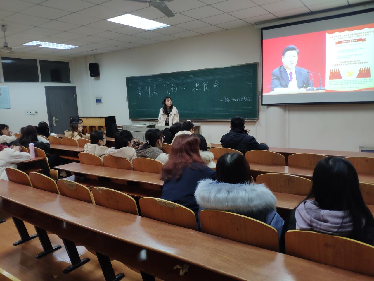 学习伊始,由各班团支部召开班团会,组织全体同学以习近平总书记在党的十九届四中全会上的重要讲话和《中共中央关于坚持和完善中国特色社会主义制度、推进国家治理体系和治理能力现代化若干重大问题的决定》为主要内容展开学习。在会议中,团支书带领同学们通读原文,观看专家辅导报告,使同学们深入了解党的十九届四中全会精神,感受守初心,担使命的革命主题。在会议最后各位同学积极踊跃发言,励志要肩负新时代青年的重任,积极投入到“青春心向党•建功新时代”主题宣传教育实践活动中去,用奋斗绽放新时代最美芳华。