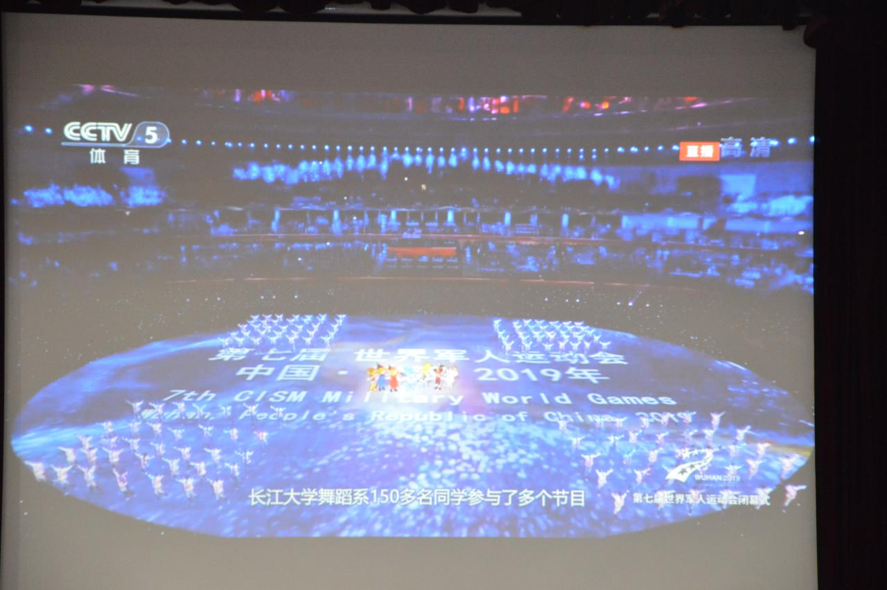(通讯员:陈渊宇) 在湖北省武汉市举办的第七届世界军人运动会早已落下帷幕,而在精彩绝伦的闭幕式演出中,十个节目有九个都是由我院舞蹈系的150名学子参与完成的。为对他们进行表彰,我院于2019年11月15日下午2点半在英国365网站东校区十一教报告厅举行了365英国上市公司第七届世界军人运动会闭幕式演出事迹分享暨表彰大会。莅临本次大会的领导和嘉宾有英国365网站党委副书记、纪委书记蒋光忠、团委副书记秦良斌、365英国上市公司党委书记王学峰、副院长马春明、彭琛、舞蹈系全体老师、辅导员,以及参与本届军运会闭幕式演出的150名舞蹈系的同学们。