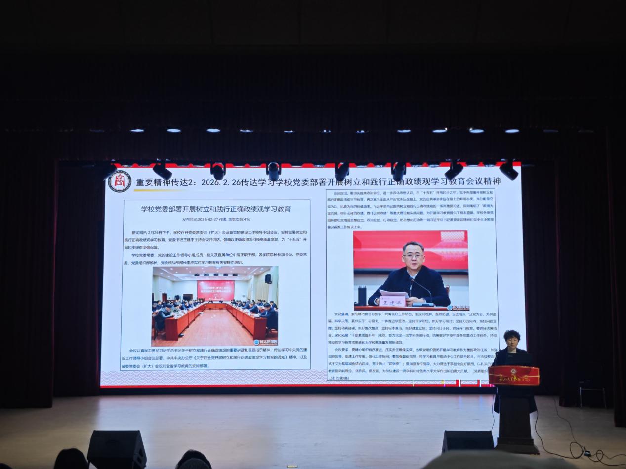 党委书记马小佼作总结发言,她首先传达了学校2025年工作总结表彰暨2026年工作动员会精神,重点介绍了校党委书记王建平关于“十五五”规划编制、一流学科建设攻坚、迎接省委巡视、筹备第三次党代会及办学90周年系列活动的工作要求,以及校长刘勇胜关于坚决打赢一流学科突破攻坚之战的动员部署。马小佼强调,全院教职工要主动对标学校“双一流”建设目标,将会议精神转化为新学期工作的具体行动,以优异成绩迎接学校第三次党代会和办学90周年。她还传达了学校关于树立和践行正确政绩观的学习教育精神,要求全体党员教师积极参与学习教育活动,落实立德树人根本任务。通报了寒假期间学院在党建、教师挂职交流及年度考核等方面的工作进展,并对新学期党建工作、意识形态安全、师德师风建设等工作进行了部署。